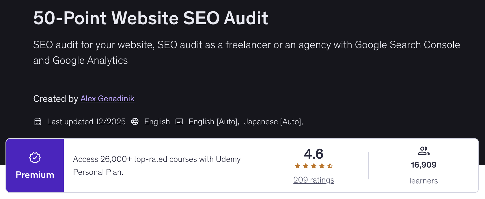 "50 Point SEO Audit" is a complete 16-module, 56-video training course, created by Alex Genadinik, that has been taught to over 16,000 students on Udemy with a 4.6 overall customer rating. It's being offered to you with PLR at a steep discount for a limited time.