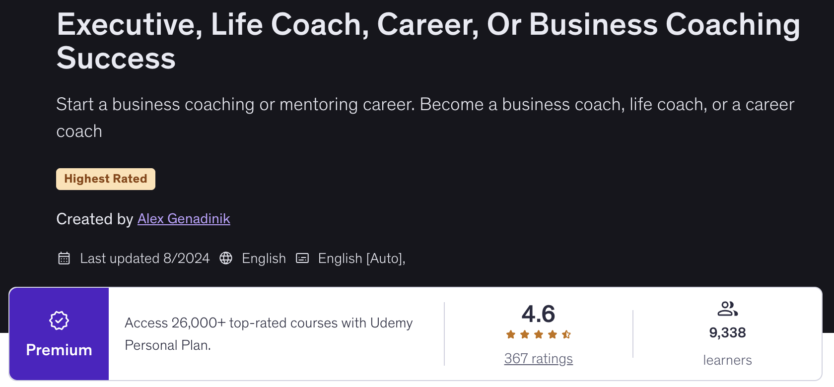 "Business Coaching Success" is a complete 15-module, 53-video training course, created by Alex Genadinik, that has been taught to over 9300 students on Udemy with a 4.6 overall customer rating. It's being offered to you with PLR at a steep discount for a limited time.