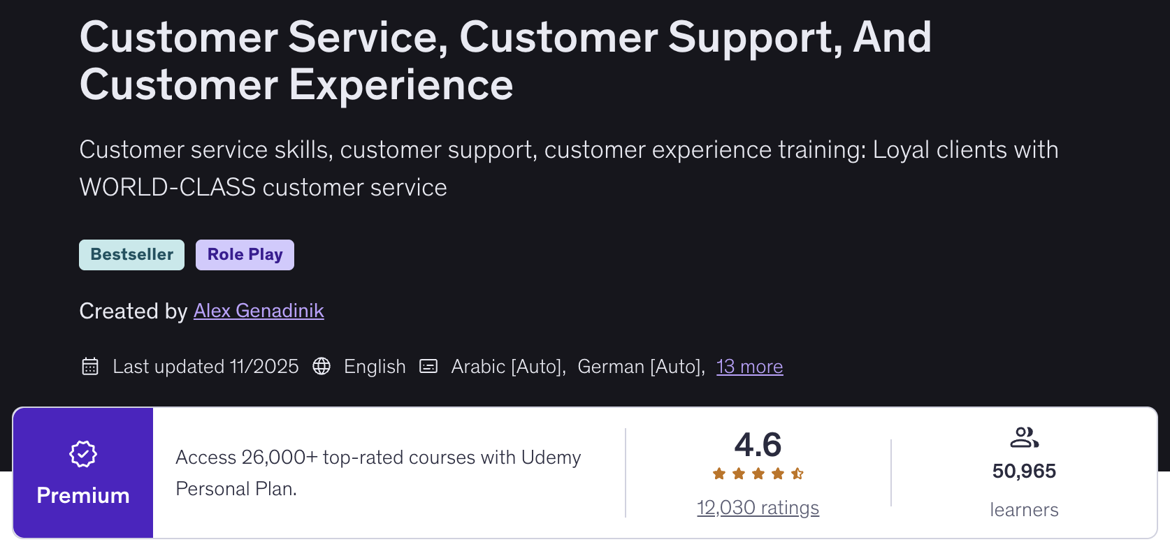 "Customer Service, Support, and Experience" is a complete 14-module, 70-video training course, created by Alex Genadinik, that has been taught to over 50,000 students and with a 4.6 overall customer rating. It's being offered to you with PLR at a steep discount for a limited time.