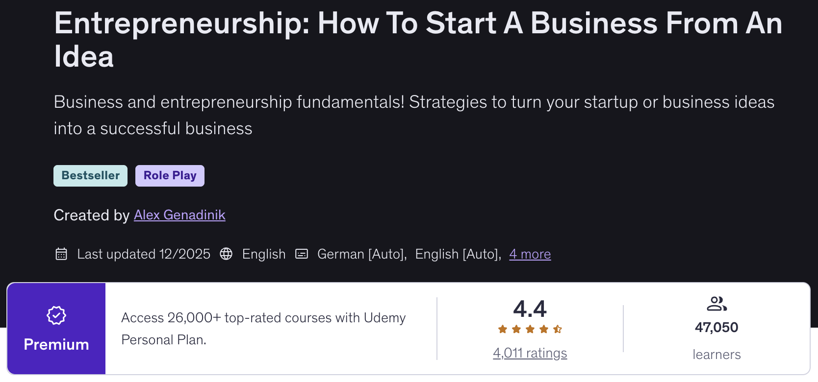 "Entrepreneurship - Start Your Business" is a complete 25-module, 149-video training course, created by Alex Genadinik, that has been taught to over 47,000 students on Udemy with a 4.4 overall customer rating. It's being offered to you with PLR at a steep discount for a limited time.
