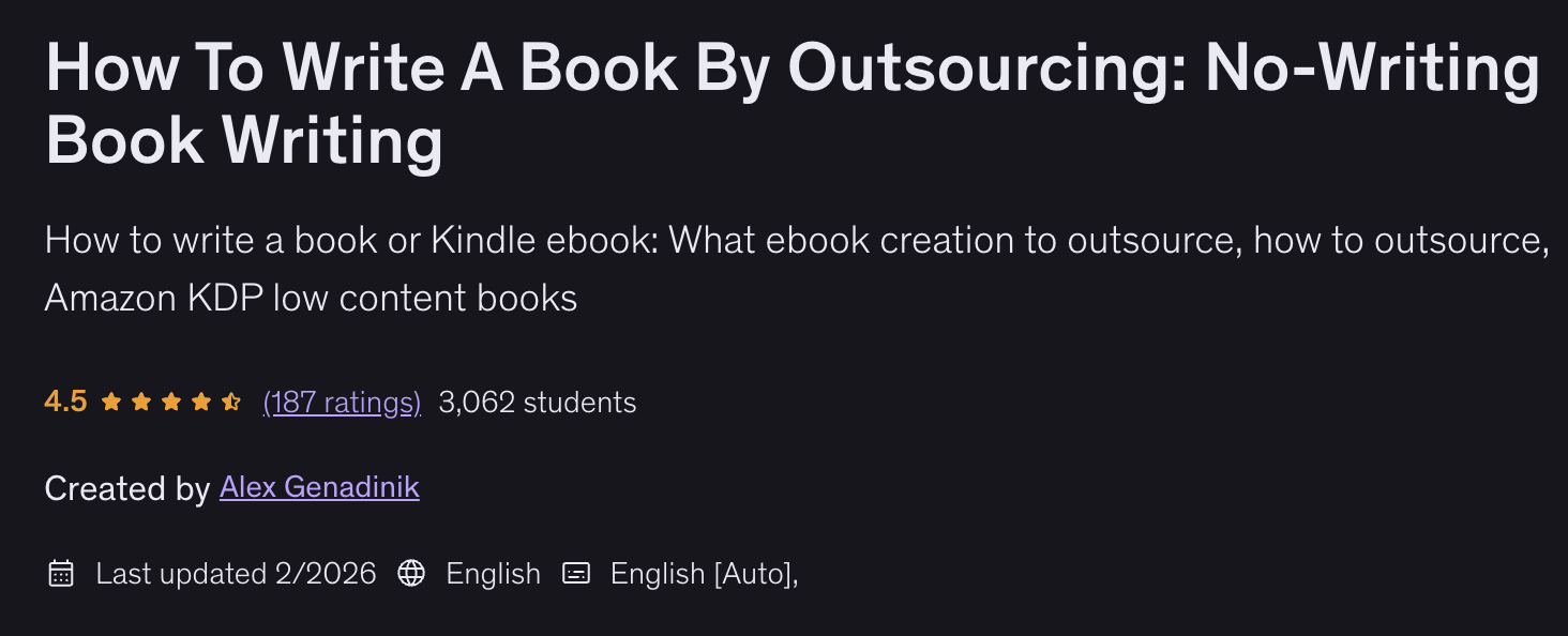 "No Writing Book Writing" is a complete 8-module, 22-video training course, created by Alex Genadinik, that has been taught to over 3000 students on Udemy with a 4.5 overall customer rating. It's being offered to you with PLR at a steep discount for a limited time.