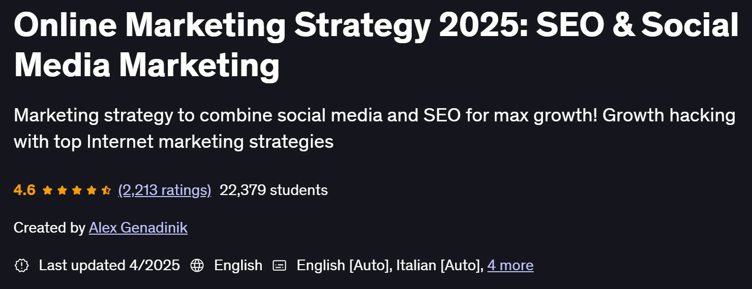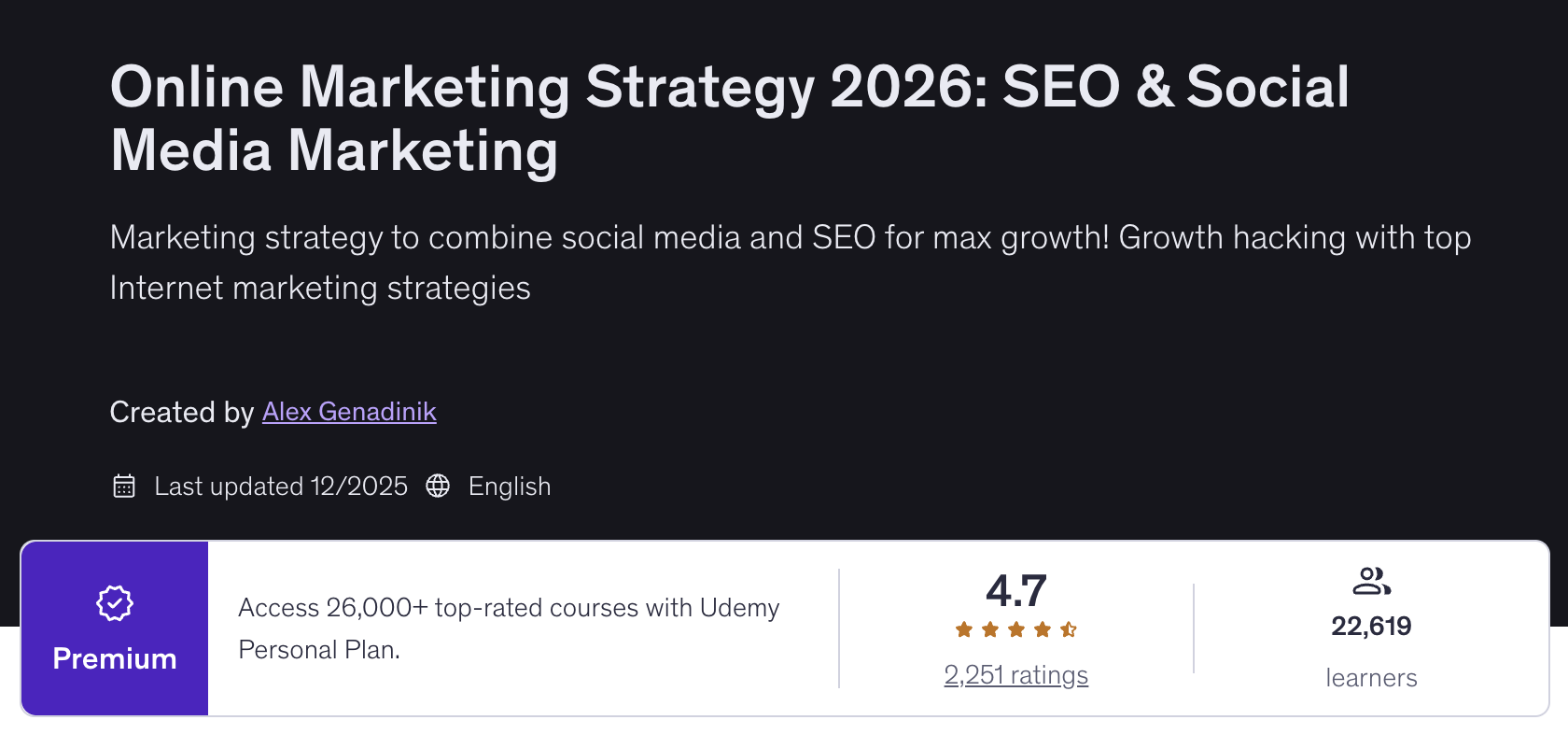"The Marketing Strategy: To reach 1,000,000 SEO and Social Media by Alex Genadinik is a great course that provides a real world example on how to increase your social media presence through the focus of SEO strategies for long-tail words. I also found the case studies and numerous examples helpful to improve the process of SEO and work through problems."