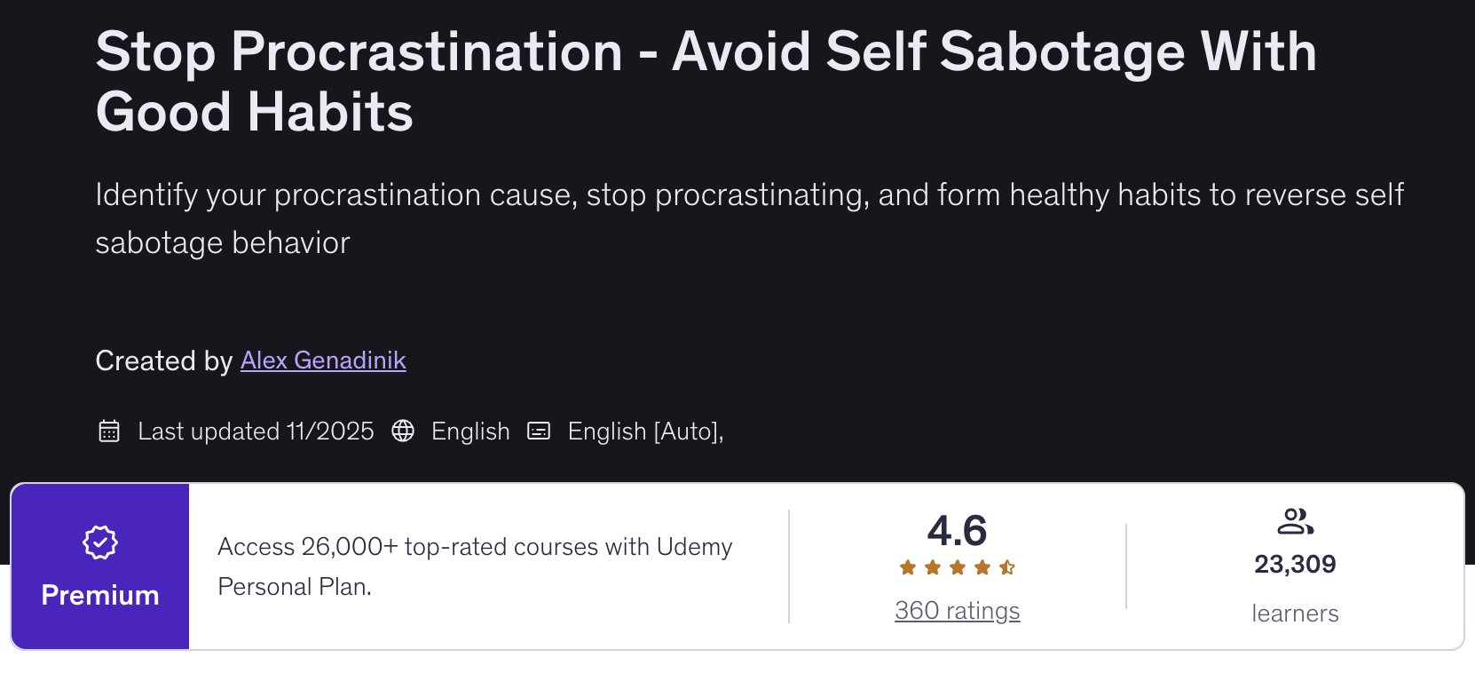 "Procrastination Reversal" is a complete 10-module, 34-video training course, created by Alex Genadinik, that has been taught to over 23,000 students on Udemy with a 4.6 overall customer rating. It's being offered to you with PLR at a steep discount for a limited time.