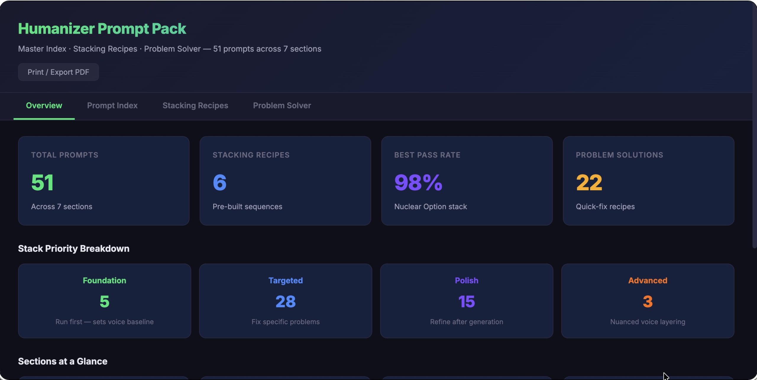 - 51 prompts across 7 sections + 6 documented stacking combos