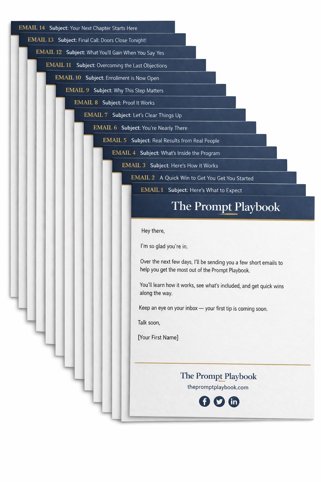 - 14 emails with subject lines, send timing, and body copy