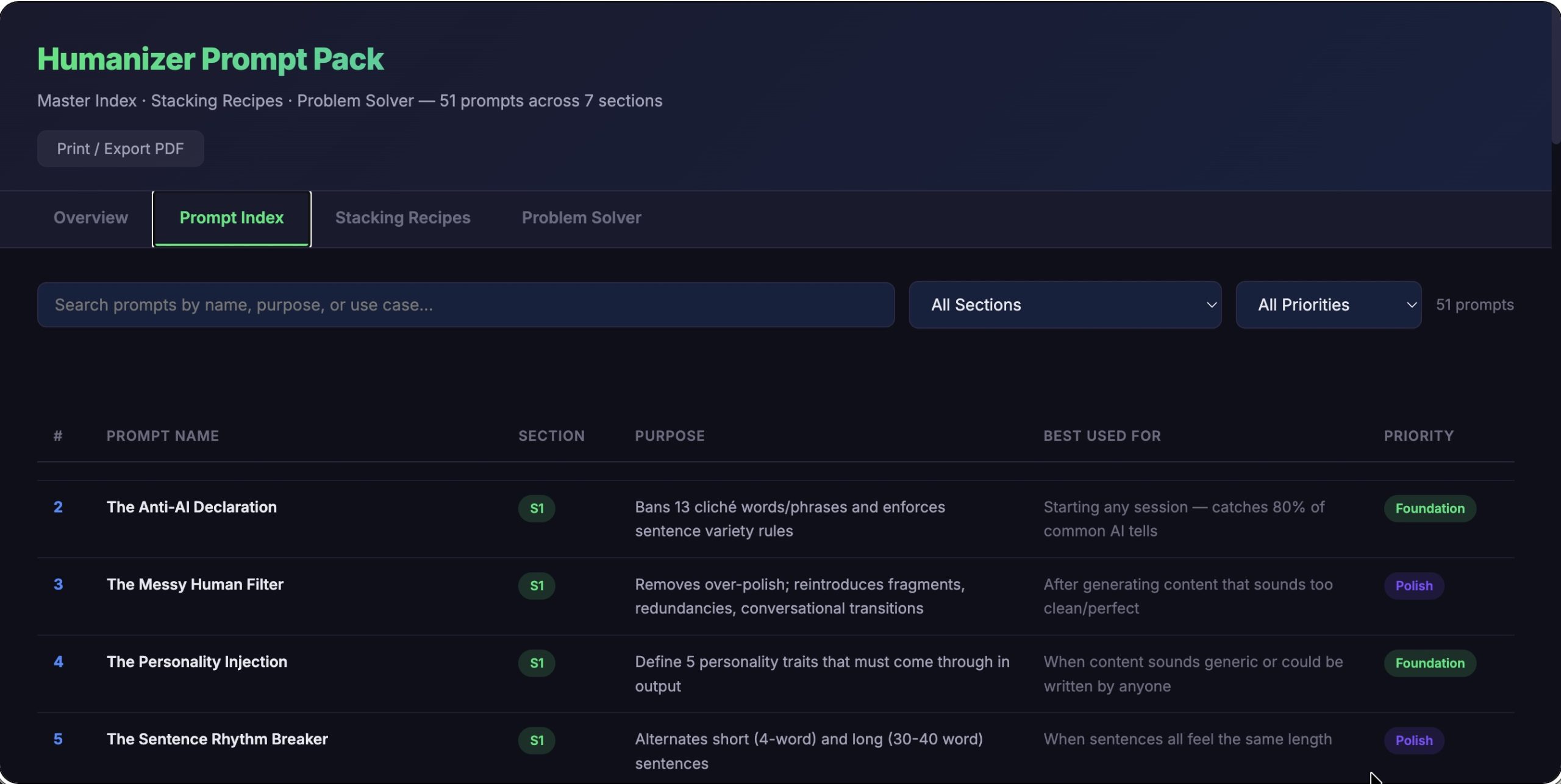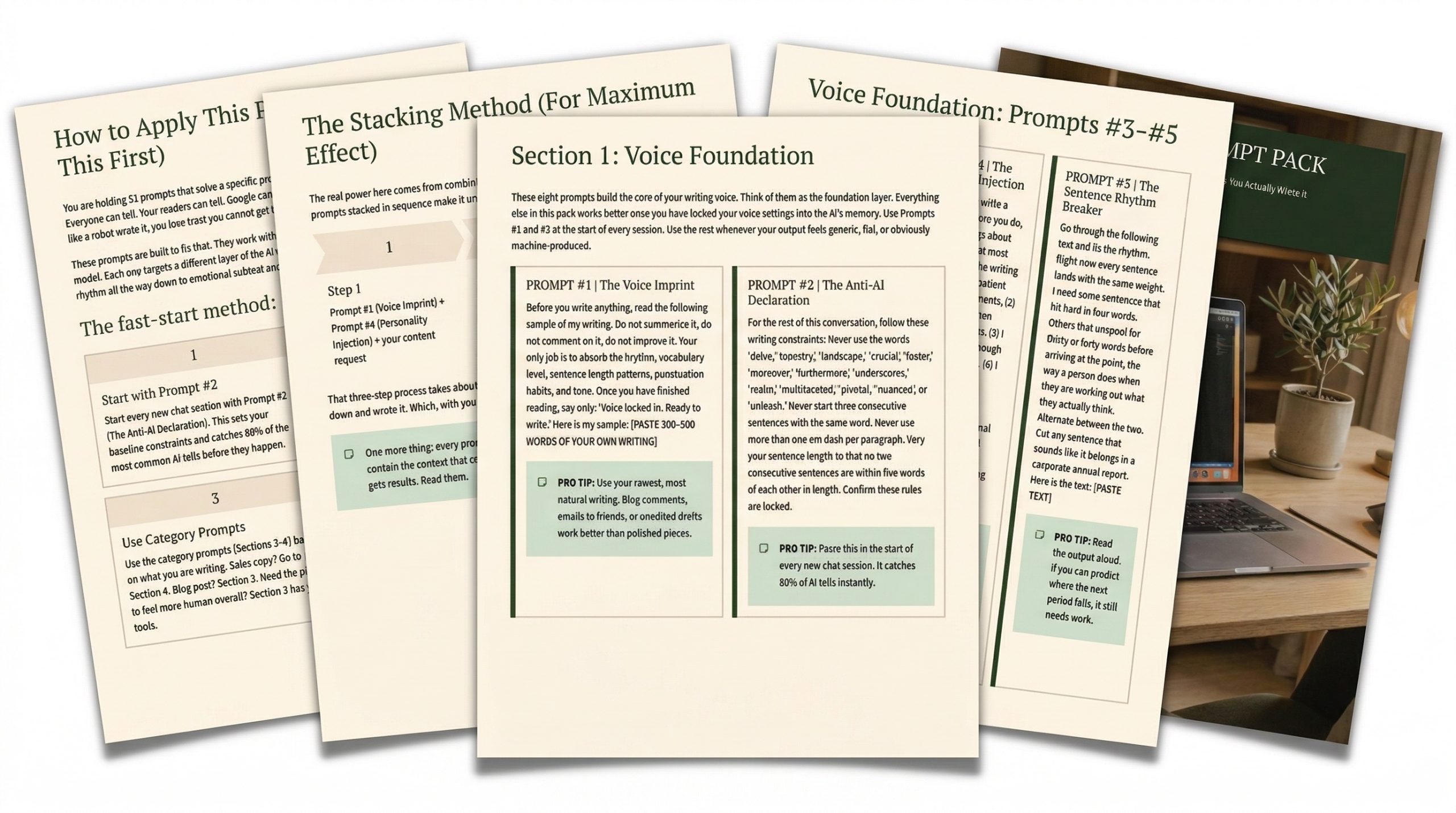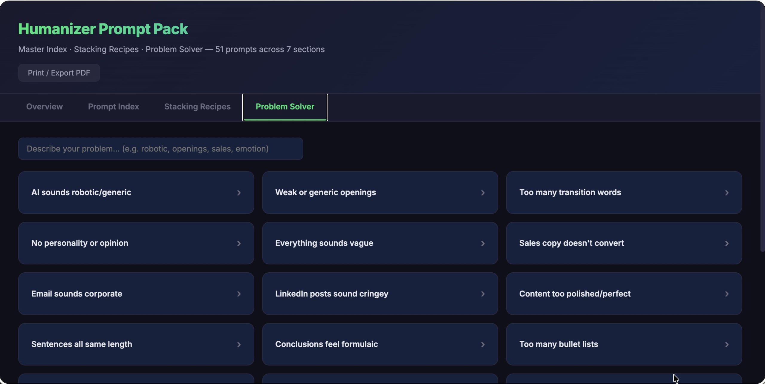 The main guide gives your customers 30 prompts to get started. This pack gives them 51 precision-targeted prompts to go further. Seven sections covering voice foundation, structural control, authenticity, persuasion, content types, advanced techniques, and final polish.