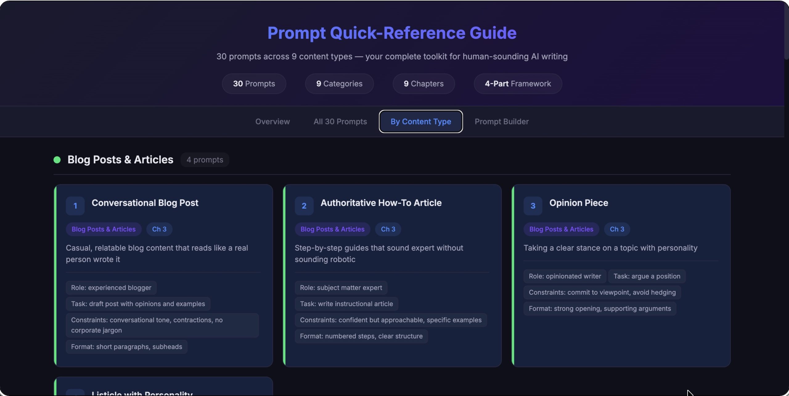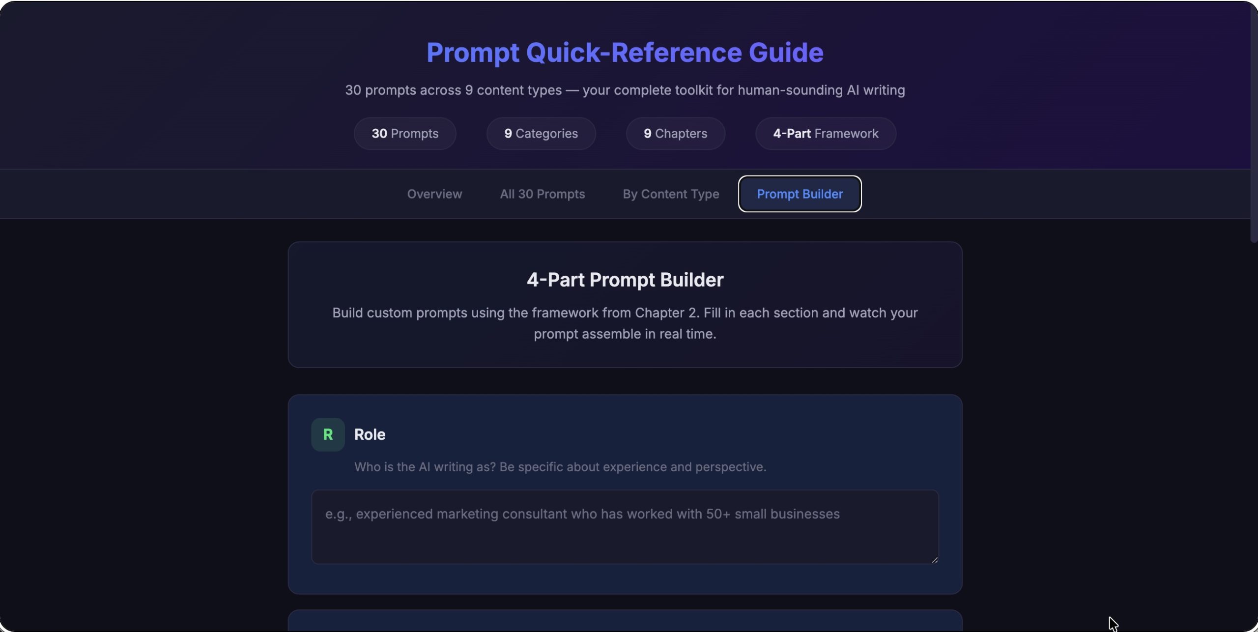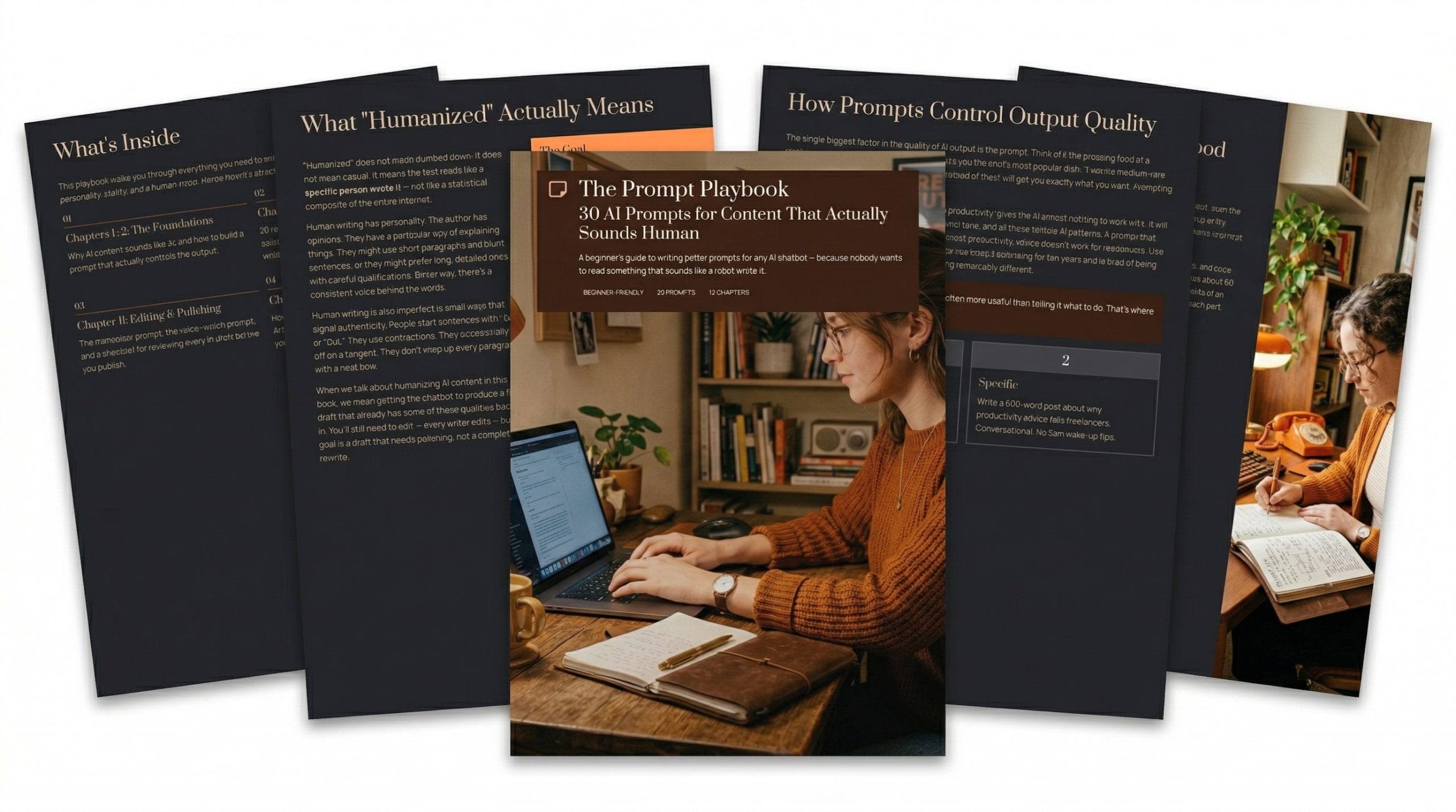 A 12-chapter guide built around 30 ready-to-use prompts covering 10 content categories. Blog posts, social media, email marketing, website copy, sales pages, professional documents. Every prompt follows a four-part framework (Role, Task, Constraints, Format) that takes about 60 seconds to learn and immediately changes the quality of any AI chatbot's output. This is the flagship product your customers will open first.