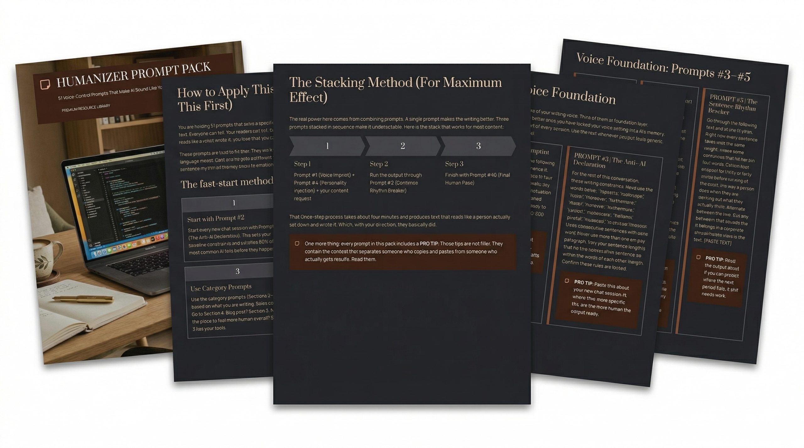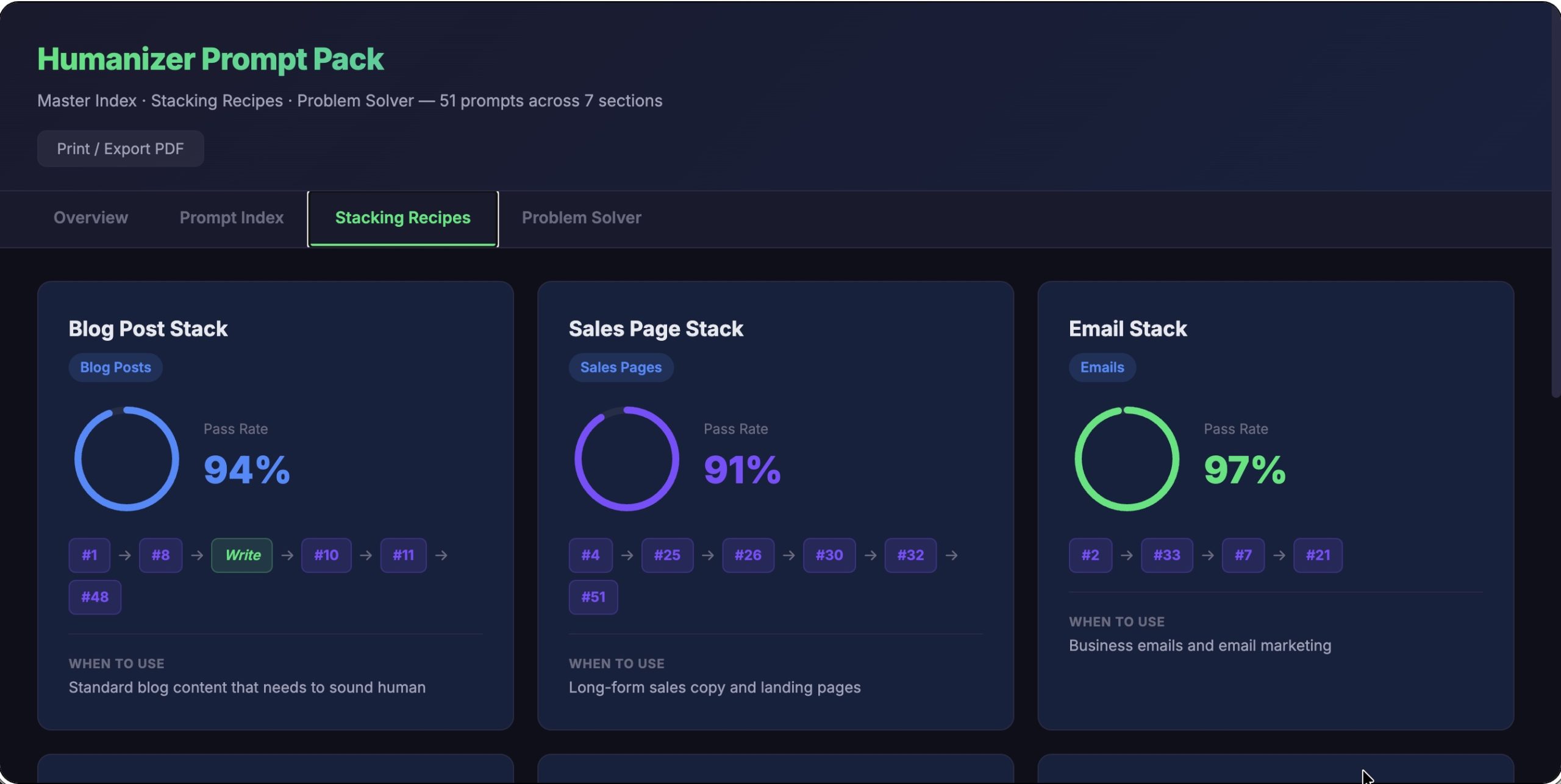 The real differentiator here is the stacking system. Combine 2-3 prompts in sequence and the output passes human-detection tests at rates between 91% and 98%. Those numbers are documented in the pack, not guesses.
