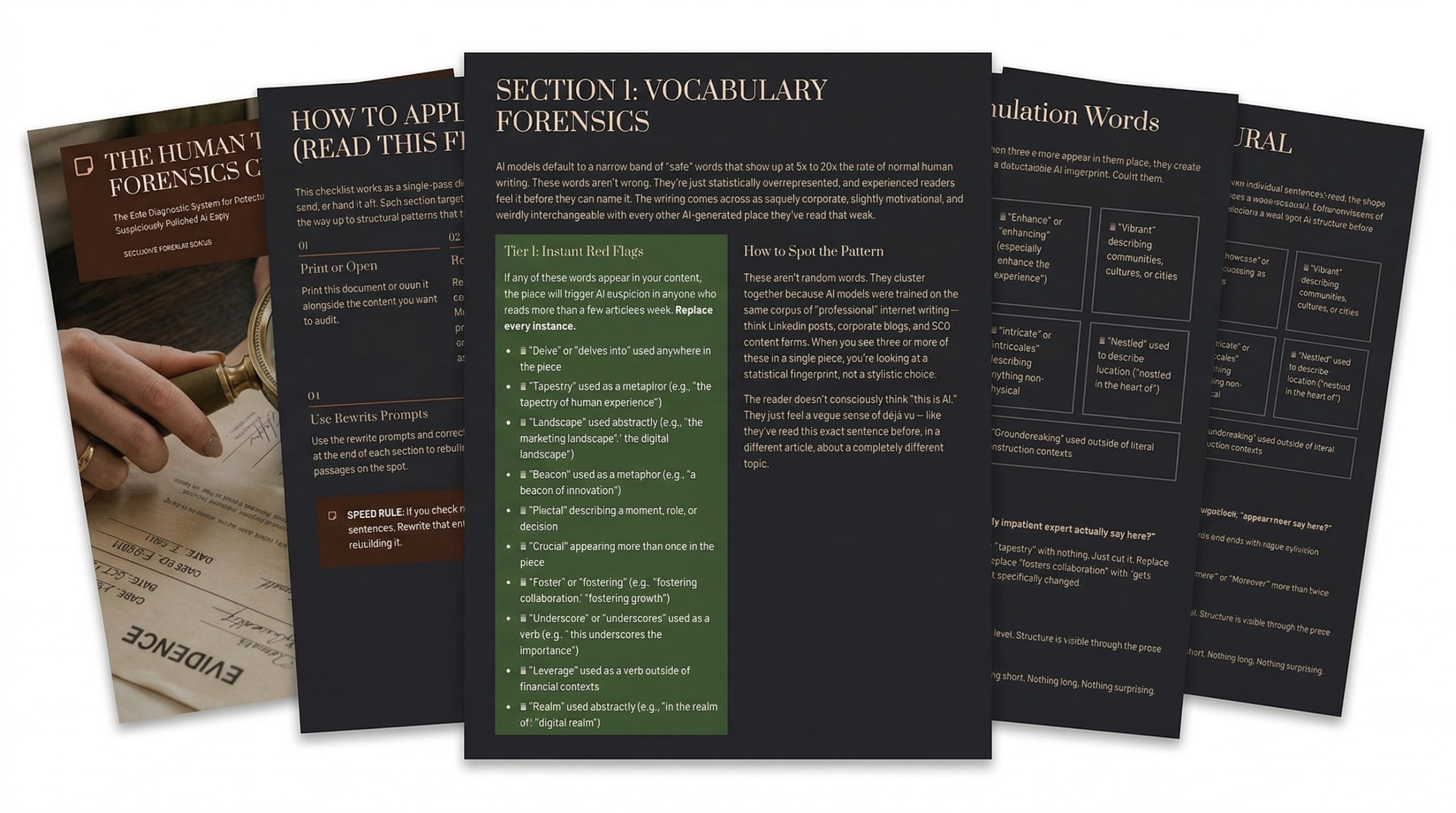 Seven forensic sections targeting different layers of AI detection: vocabulary red flags, structural tells, tone audits, grammar patterns, content depth, formatting giveaways, and advanced expert-level signals most people never think to check. Each section includes correction formulas and rewrite prompts so you fix the problem on the same page you found it.