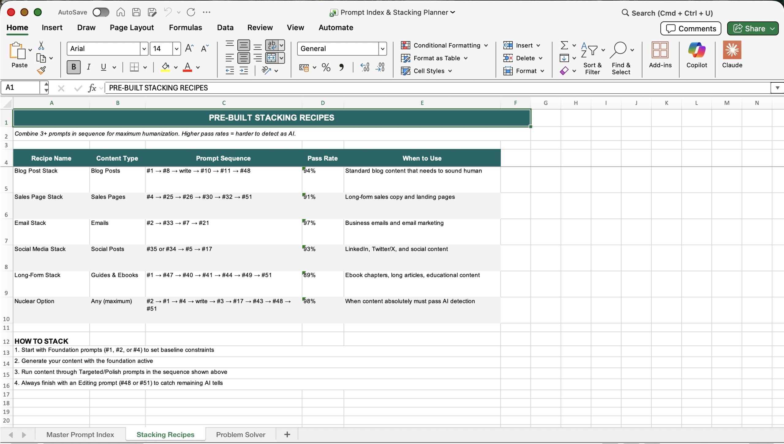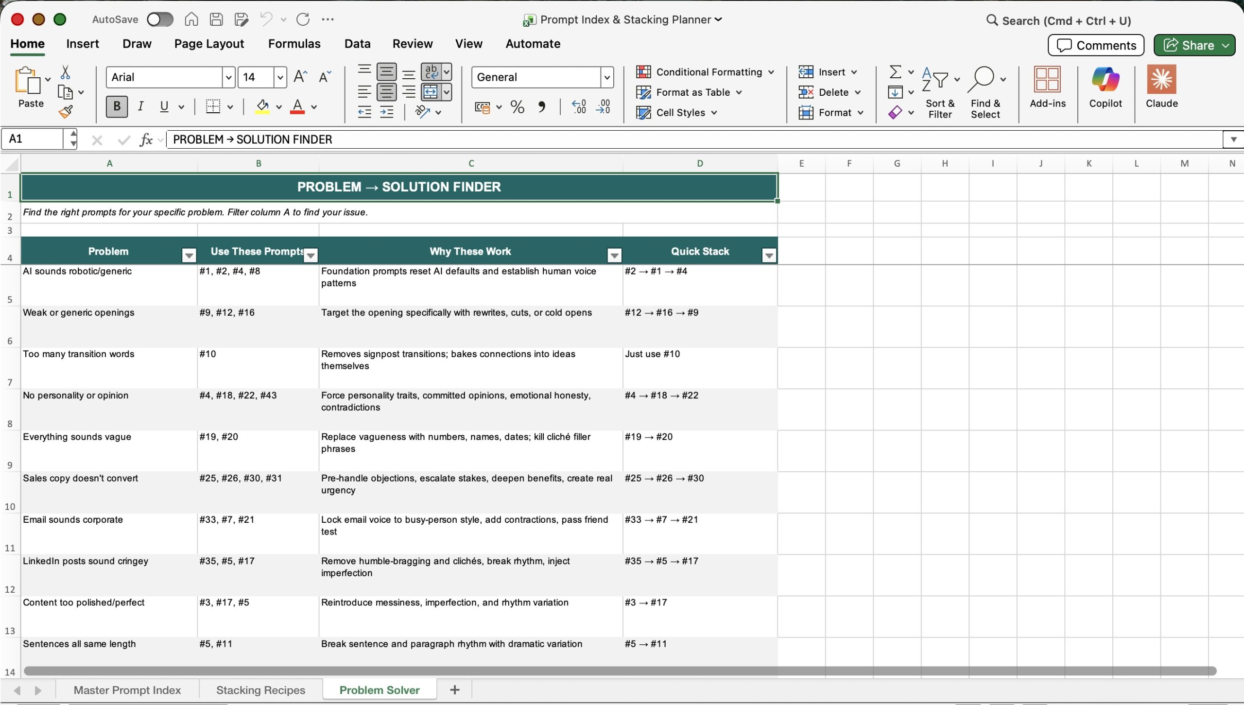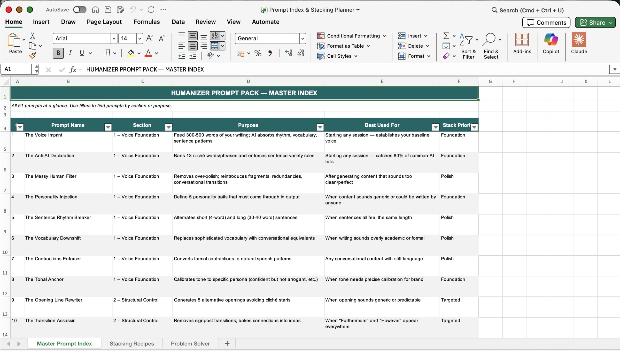 The Humanizer Prompt Pack spreadsheet makes it convenient for your customers to do search by problem type, content format, and recommended stack position. Click the thumbnails below to see an enlarged image of each spreadsheet tab.
