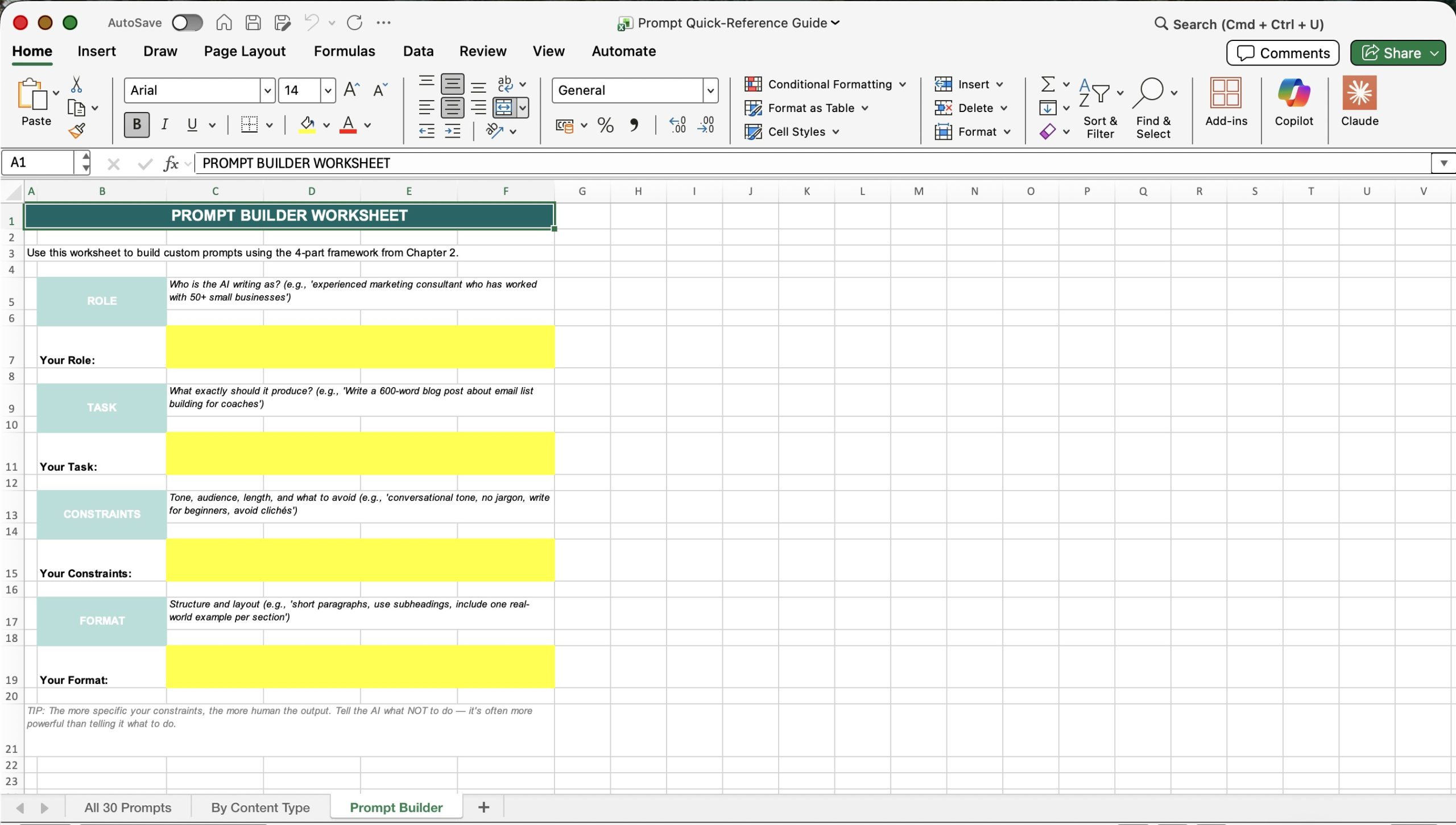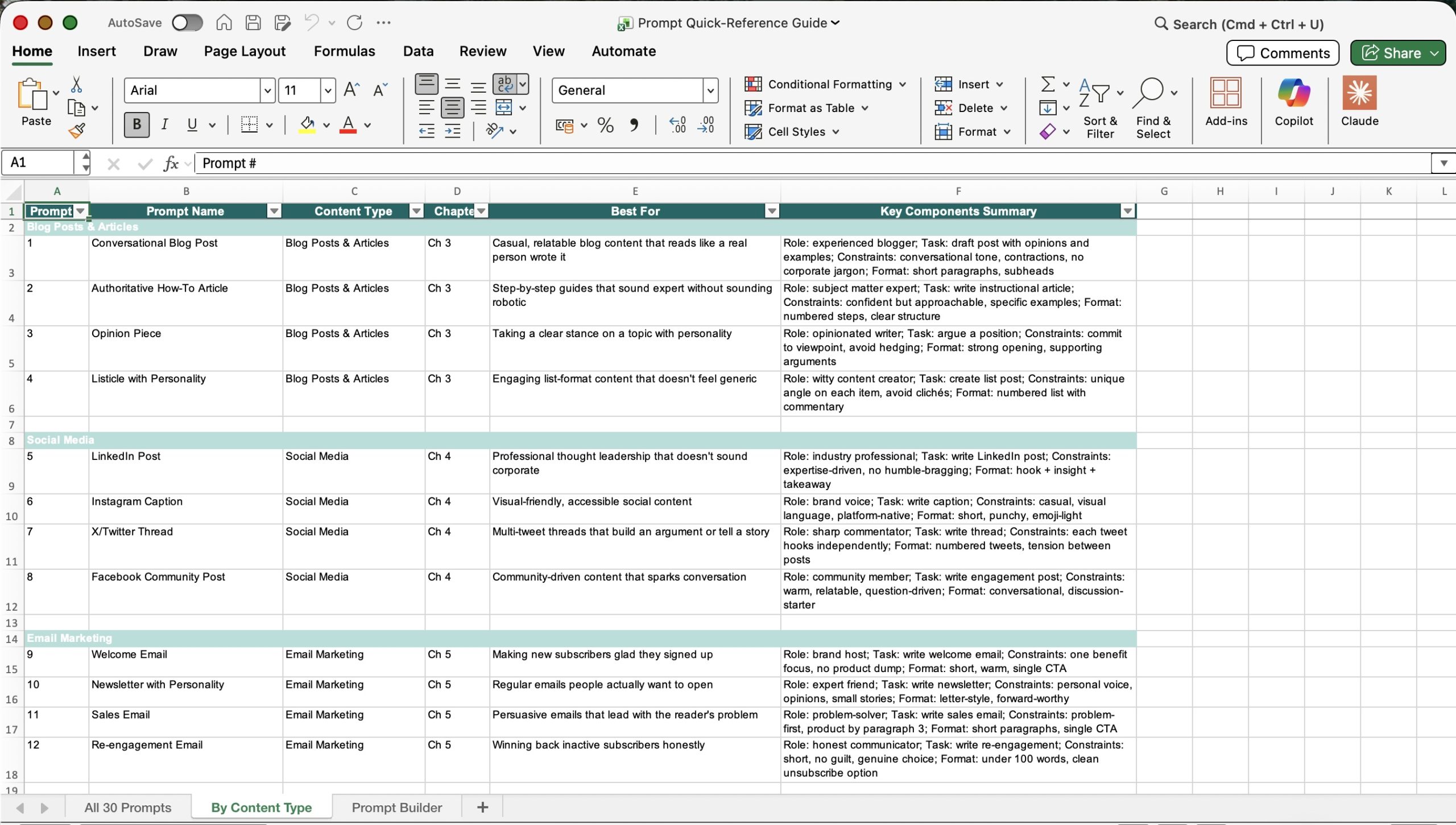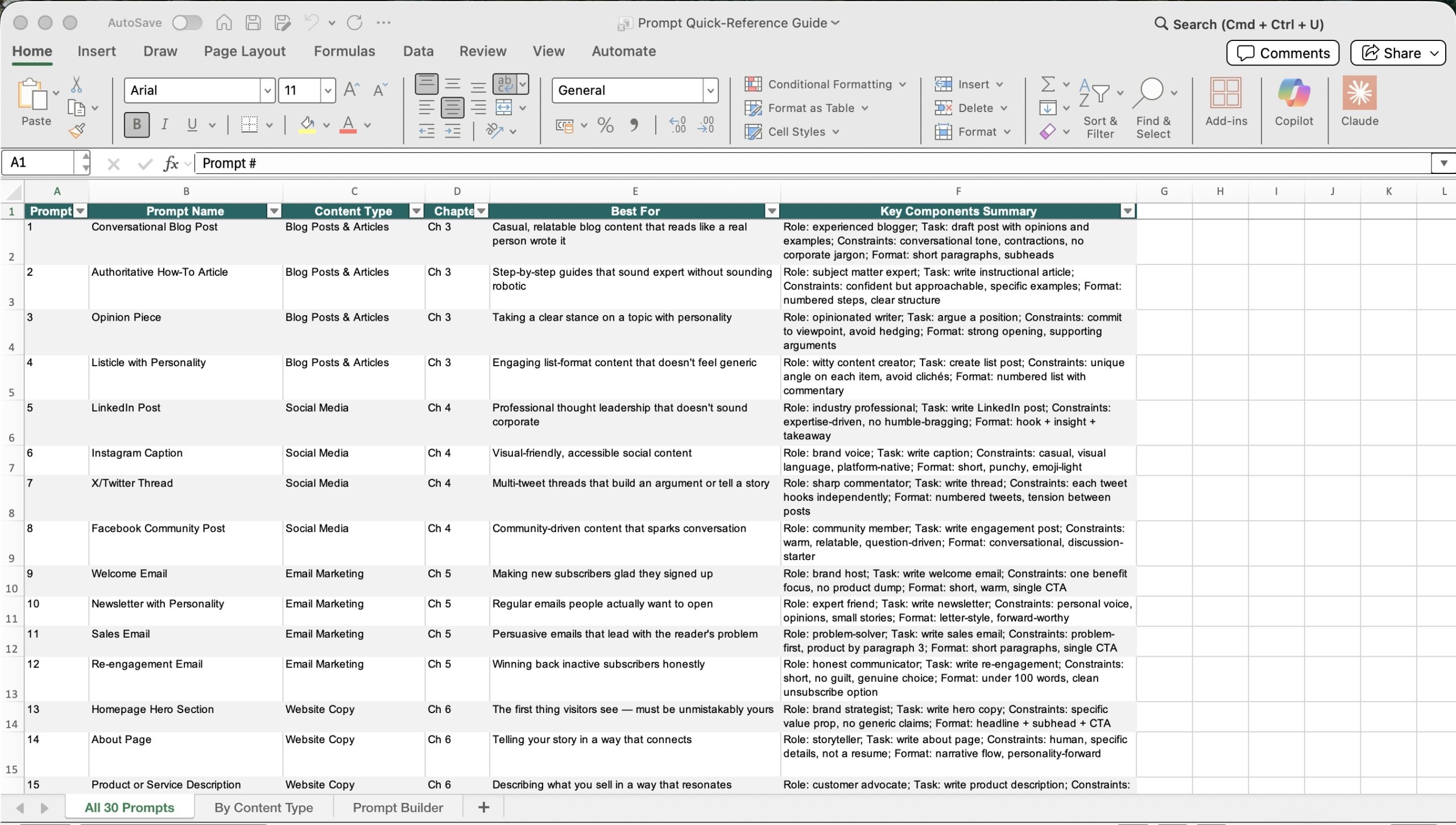 This quick reference spreadsheet gives your customers handy access to all 30 prompts, including by content type, and has a prompt builder to practice creating their own prompts. Click the thumbnails below to see an enlarged image of each spreadsheet tab.