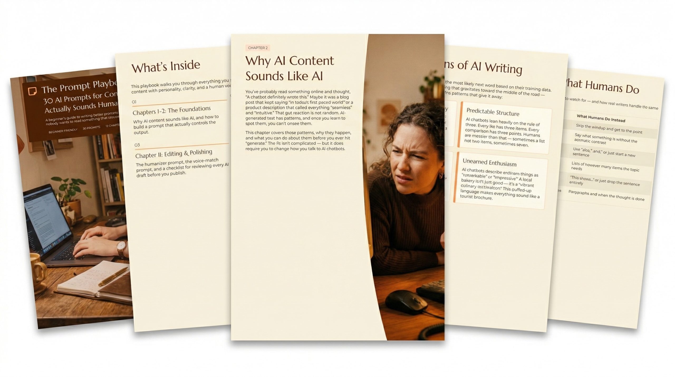 5 done-for-you products and multiple assets. Full PLR rights. One complete system for turning stiff AI output into writing that reads like a real person sat down and typed it.