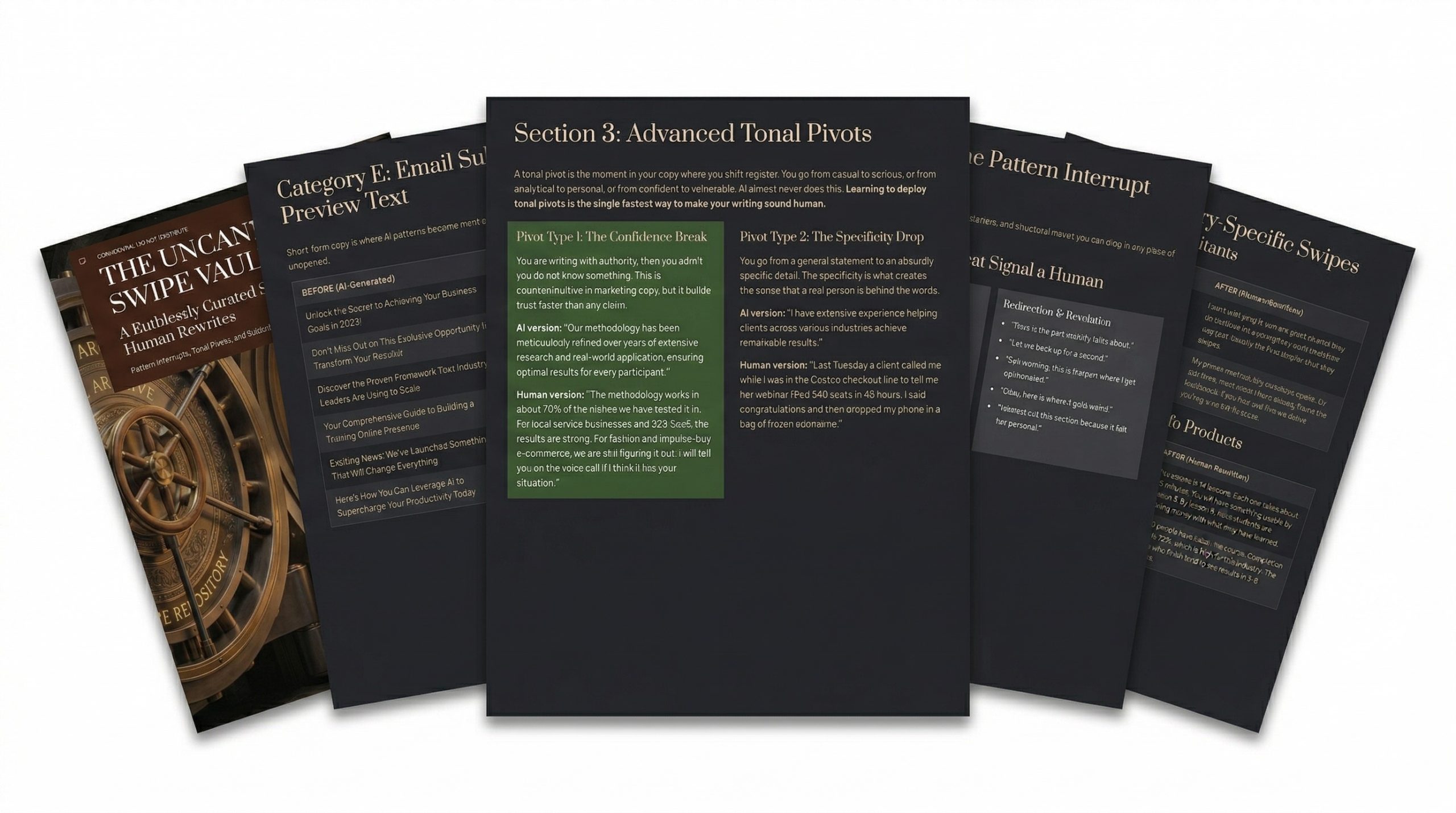 Side-by-side before-and-after rewrites across opening lines, product descriptions, credibility claims, calls to action, and email subject lines. Plus 4 advanced tonal pivot techniques, a pattern interrupt library, industry-specific swipe sections for coaches, course creators, SaaS companies, and ecommerce brands, and a complete 5-Pass Rewrite Formula.