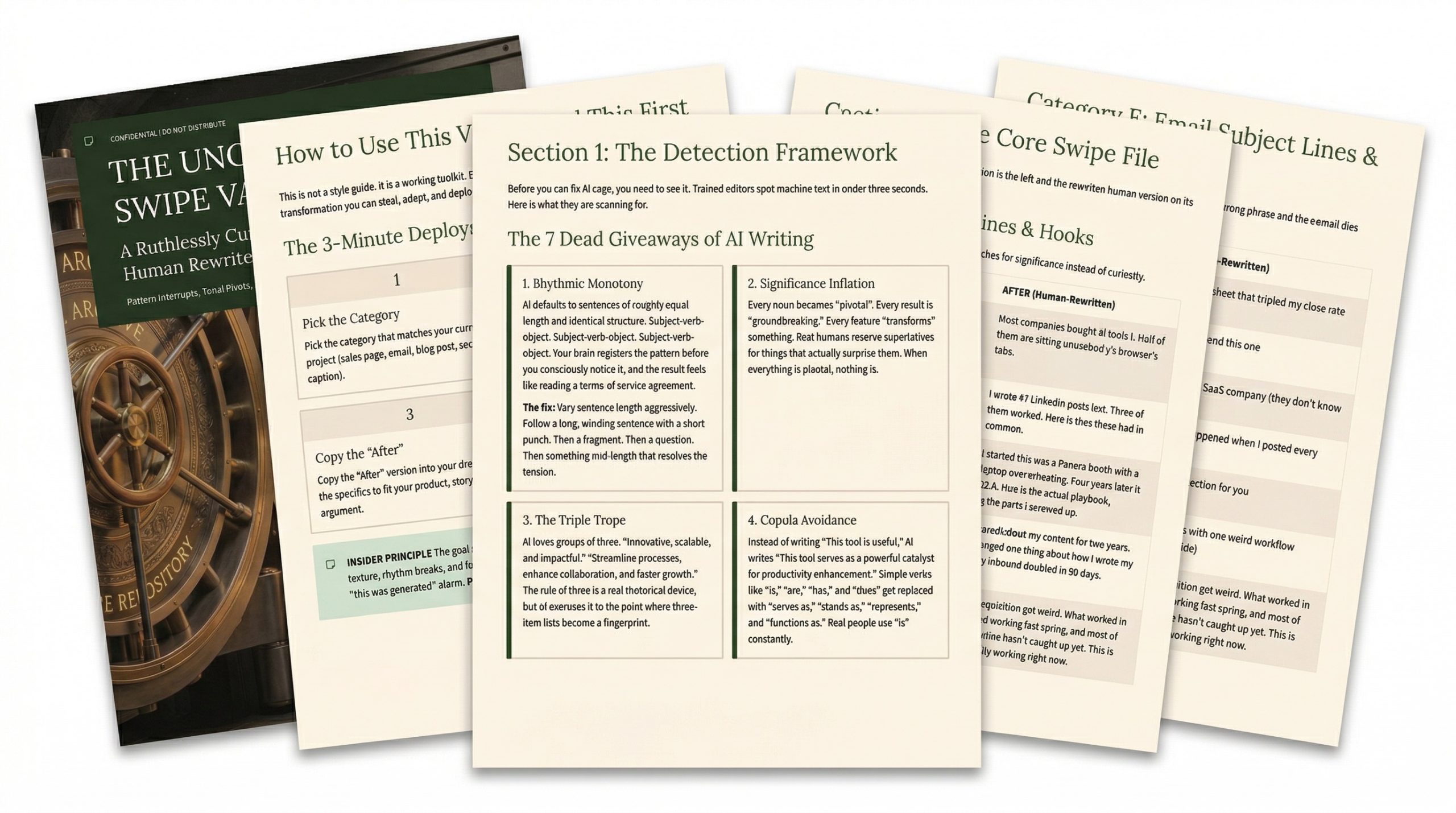 The 7 Dead Giveaways of AI Writing section is a detection framework your customers can use even without the rest of the bundle: rhythmic monotony, significance inflation, the triple trope, copula avoidance, -ing appendages, hollow authority, and the neatness problem. The industry-specific swipes cover Coaches/Consultants, Course Creators, SaaS/Tech, and E-commerce, so your customers get examples tailored to their niche.